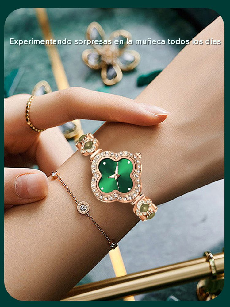 Reloj de pulsera con esfera de trébol de esmeralda para mujer